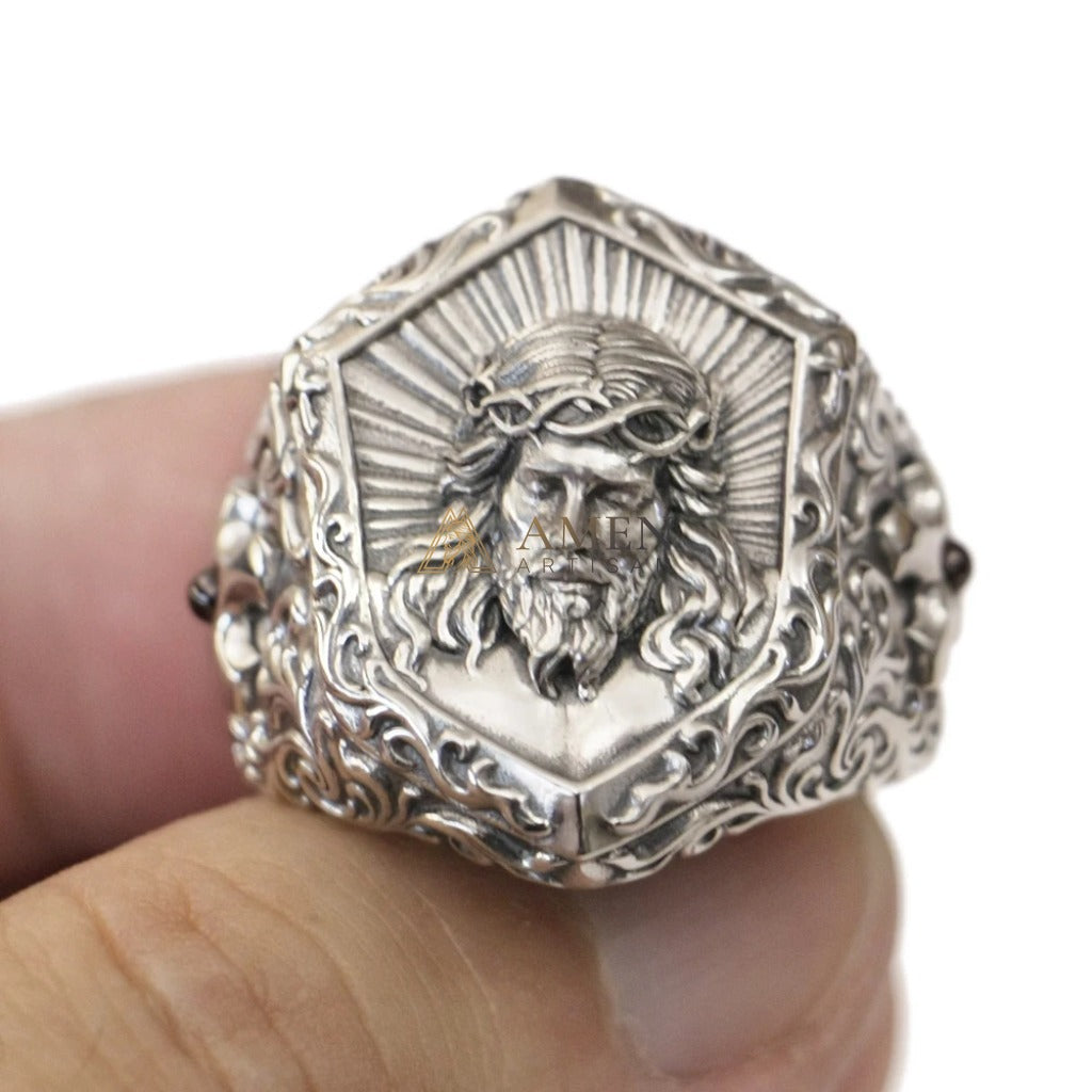 Material & Craftsmanship: Made of 925 sterling silver (skin-friendly, hypoallergenic). The high-relief 3D Jesus icon is the centerpiece, with retro scrollwork and garnet inlays on the band sides. The ring is substantial and detailed, suitable for daily wear and collection.