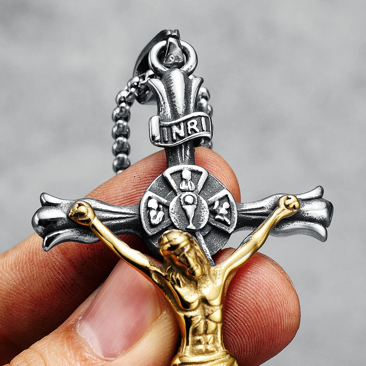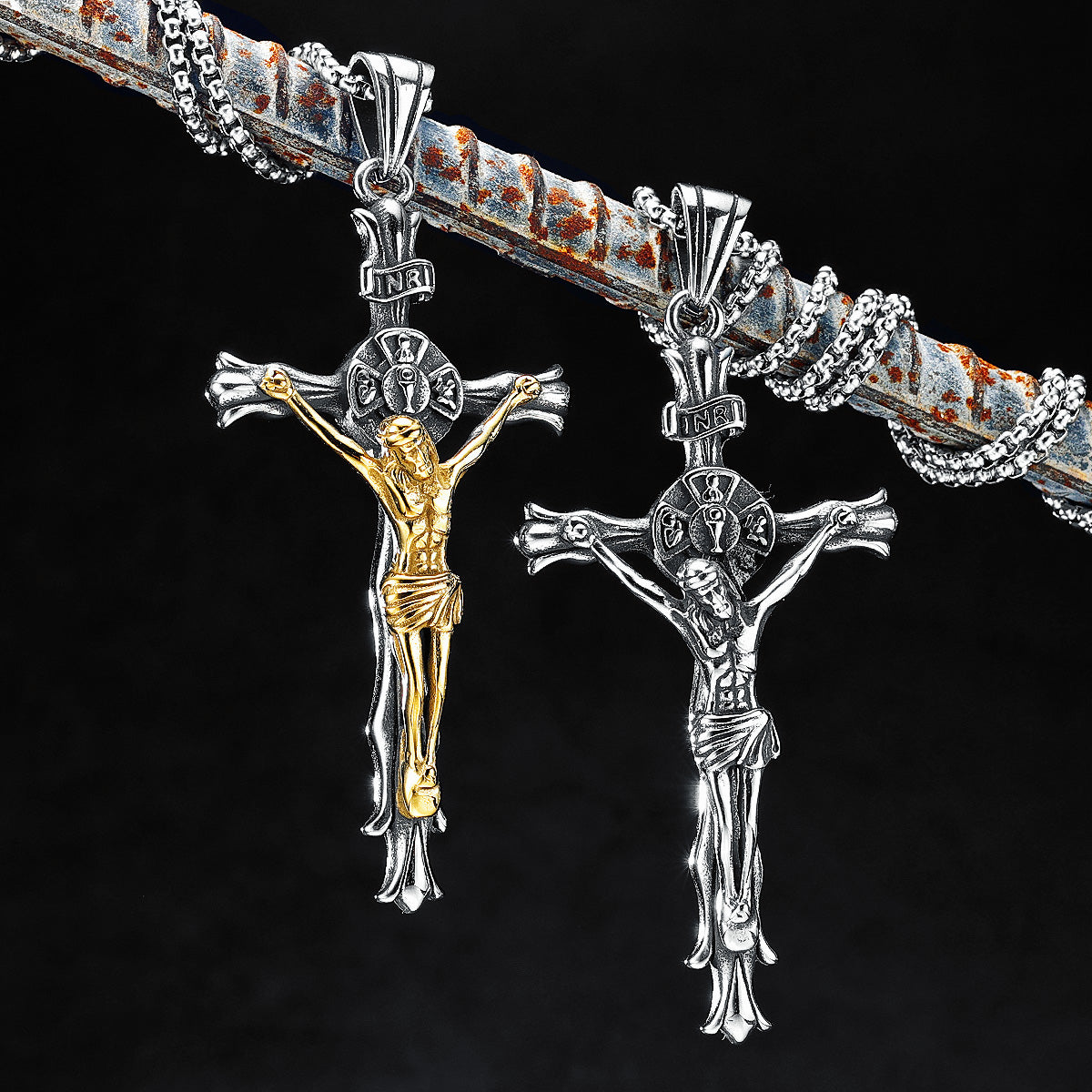 Este llamativo collar presenta una cruz dimensional de acero de titanio con detalles antiguos envejecidos, que exhibe intrincados elementos arquitectónicos góticos en miniatura. El acabado en plata oxidada realza los patrones de filigrana incrustados, suspendidos de una robusta cadena barbada que adquiere una pátina personalizada con el tiempo.