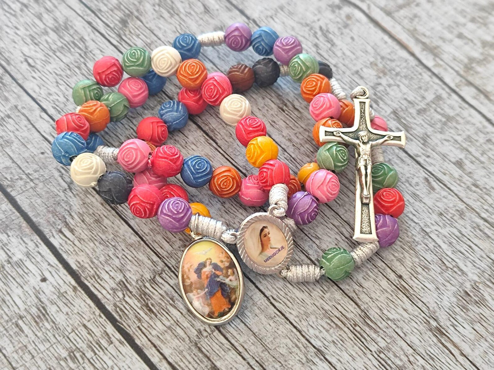 Each bead is delicately carved in the shape of a rose, representing Mary’s purity and love. The vibrant multicolor design reflects the beauty of faith blossoming through life’s trials.