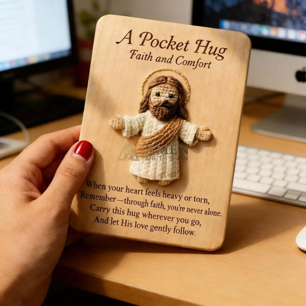"Pocket Hug" + Wooden Plaque: Metaphor for "faith’s love follows like a pocket hug" — conveying healing and strength