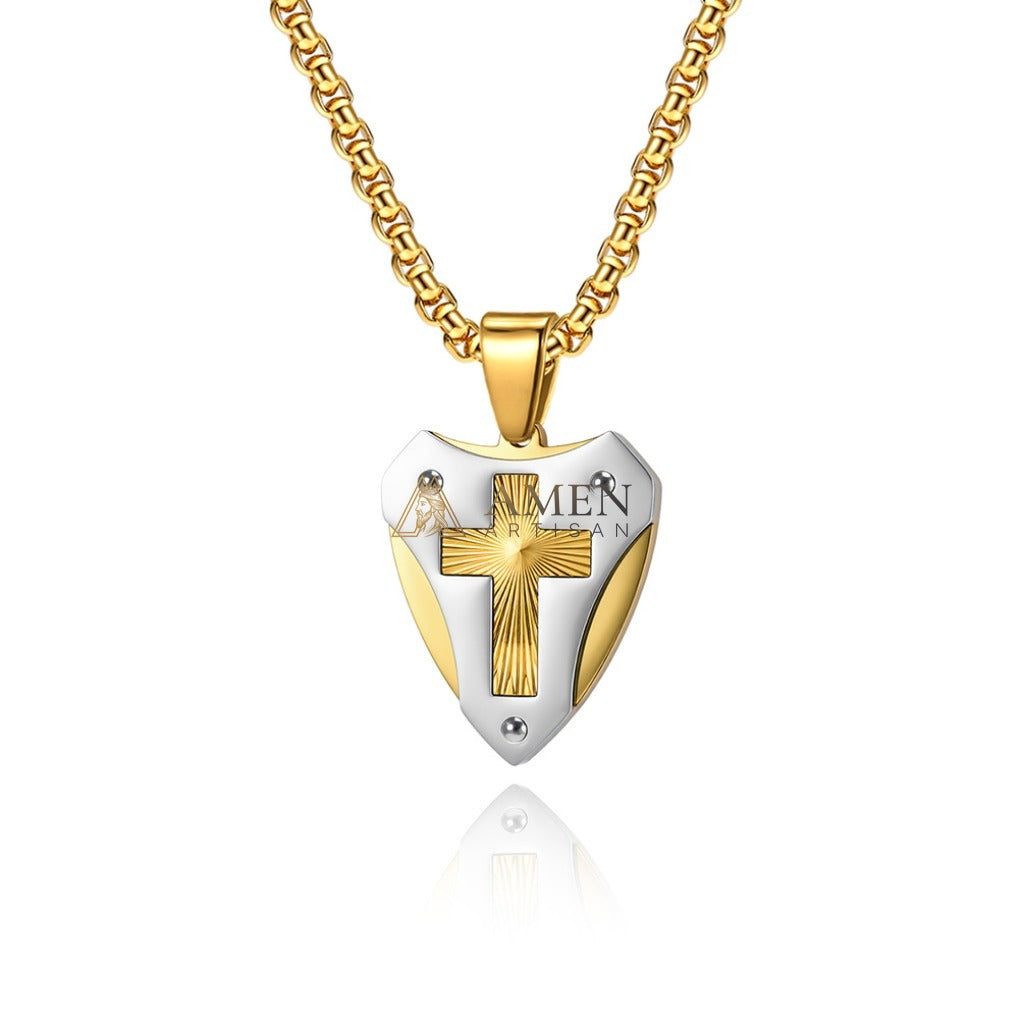 This Cross Shield Pendant Necklace blends faith protection with edgy texture: crafted from black/gold two-tone metal, the shield shape encloses a radiating cross, with rivet details enhancing the armor-style edgy vibe — merging the “faith as a shield” imagery into a neck accessory that balances security and style impact.