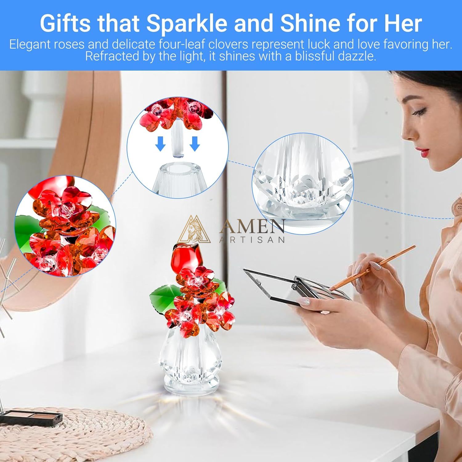 - Gifts that sparkle and shine for her: Elegant crystal roses and delicate four-leaf clovers represent luck and love favoring her. Refracted by the light, it shines with a blissful dazzle.