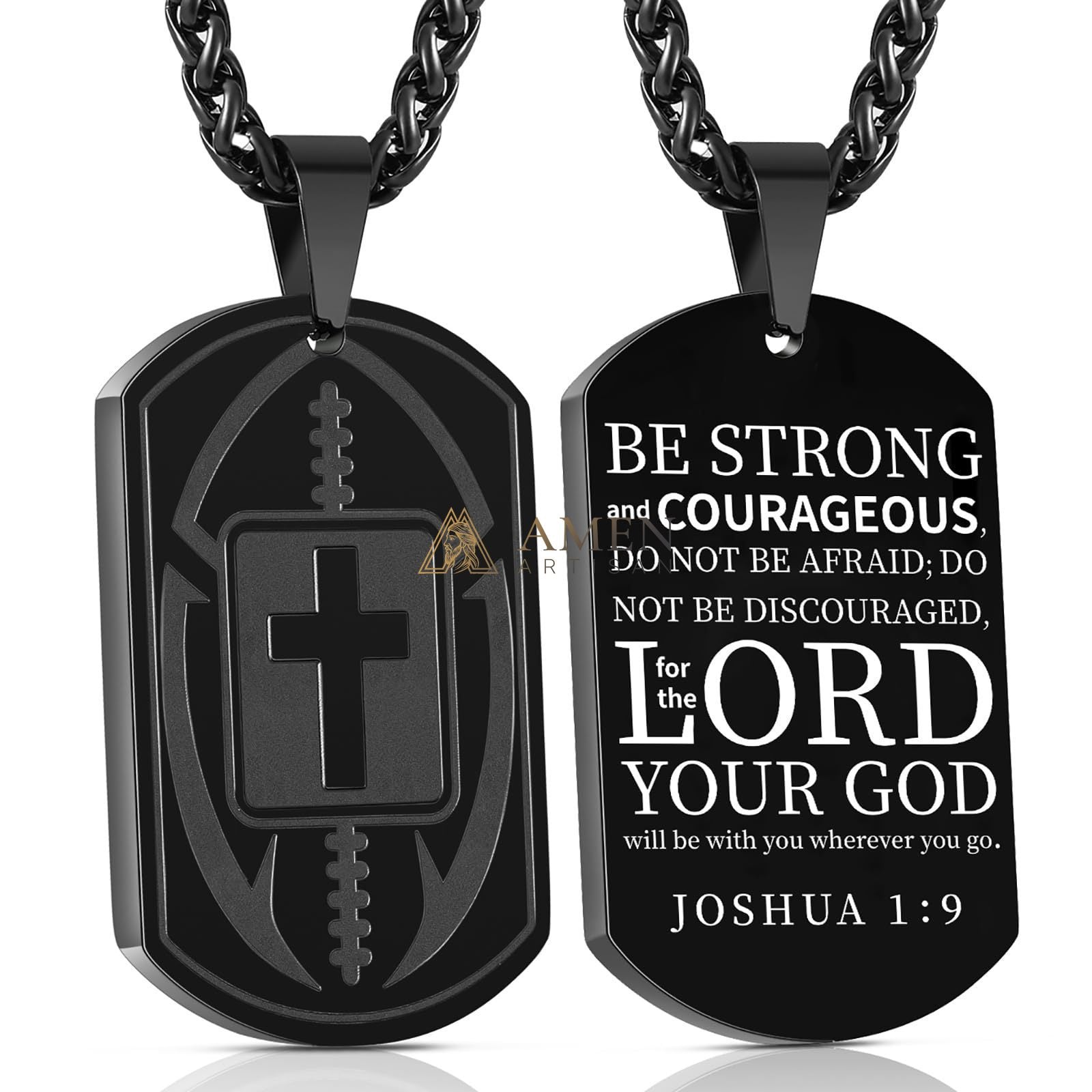 This football cross dog tag necklace merges faith and sports passion: the black titanium steel tag has a bold, cool texture — the front features a football-wrapped cross (tying passion to faith), while the back is engraved with the courageous verse from Joshua 1:9, condensing “field fearlessness” and “spiritual protection” into a compact piece.
