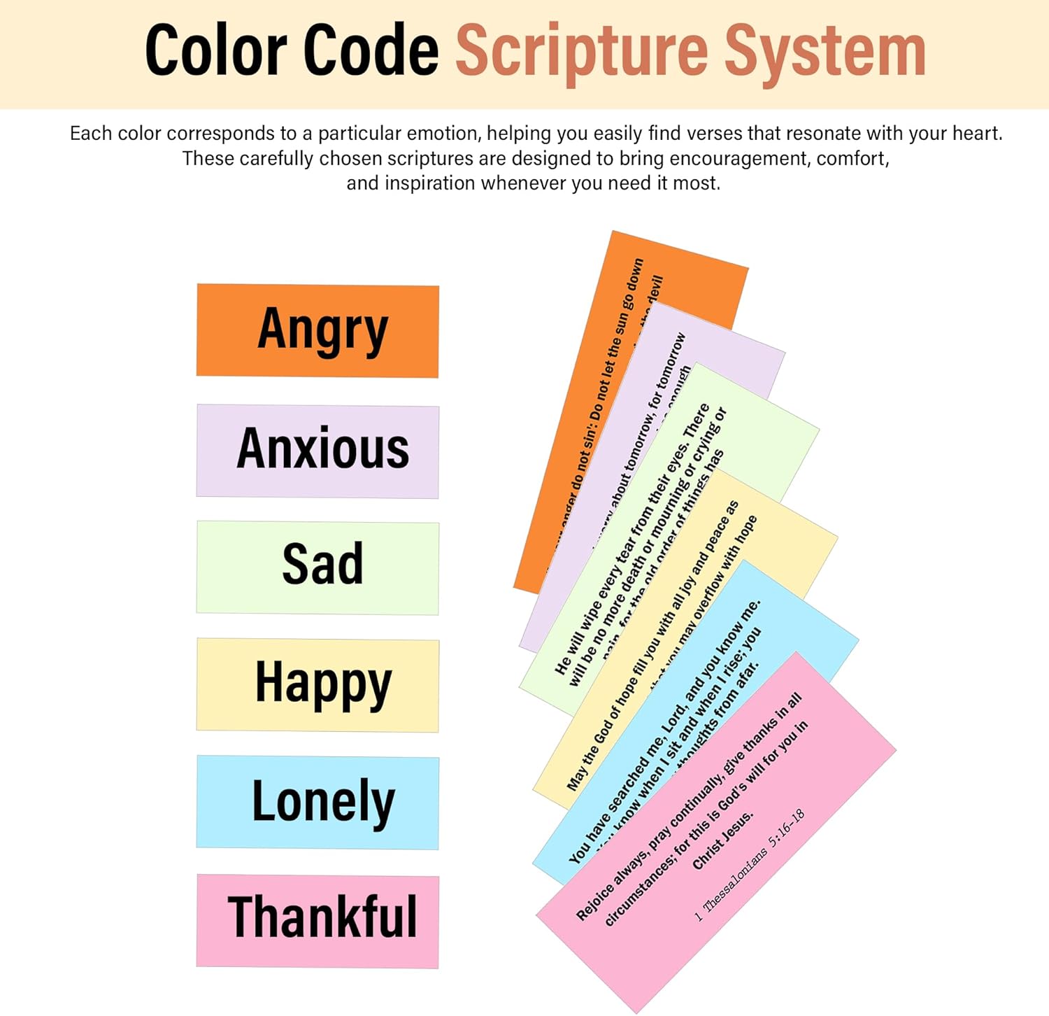 Each category is color-coded for quick access, helping you find the verse that speaks to your heart—right when you need it most. From moments of celebration to seasons of struggle, these verses offer guidance, reassurance, and spiritual renewal.