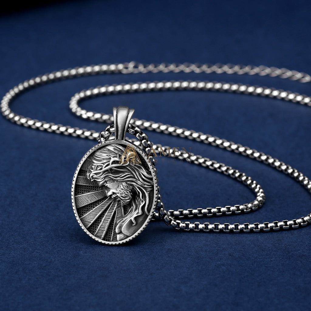 This Jesus Crown of Thorns oval pendant necklace blends faith strength with vintage texture: an oval metal plaque featuring a relief of Jesus with the Crown of Thorns, paired with a radiating background and distressed finish — condensing the core of "redemption and sacrifice" into a wearable spiritual anchor.