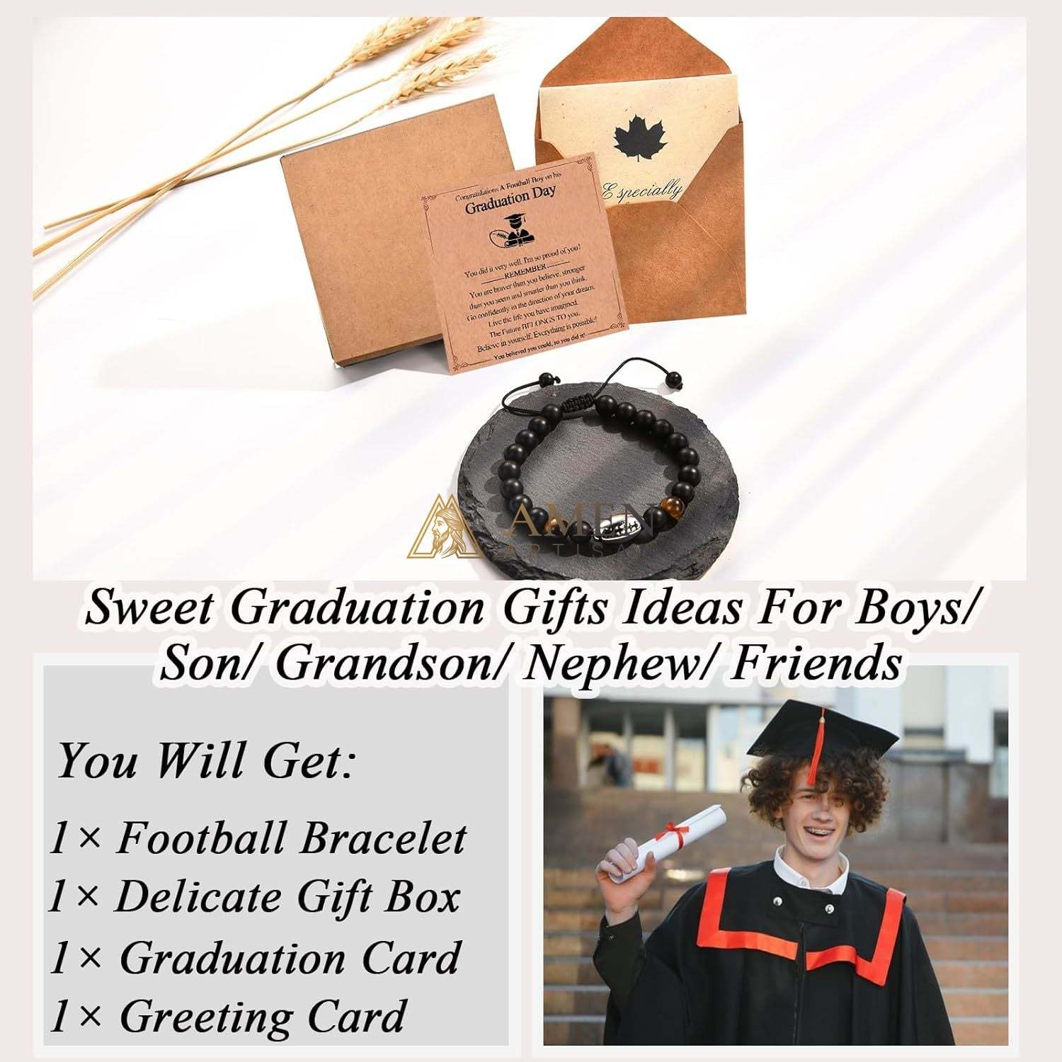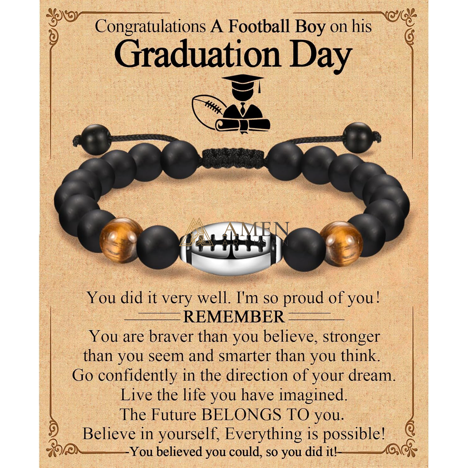This natural stone bead football braided bracelet blends sports passion with organic texture: the black bead braided base is sleek and versatile, accented with a metallic football charm and natural gemstones (tiger’s eye/lapis lazuli tiger stone, etc., depending on the style). Paired with a warm encouragement card, it turns field enthusiasm and gemstone energy into a stylish wrist accessory.