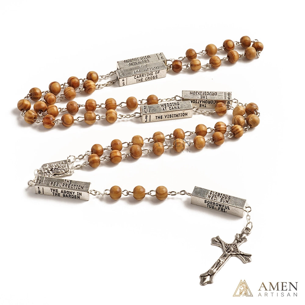 This handcrafted wooden rosary features engraved metal guide bars that mark each Mystery of the Rosary — from The Annunciation to The Coronation of Mary.