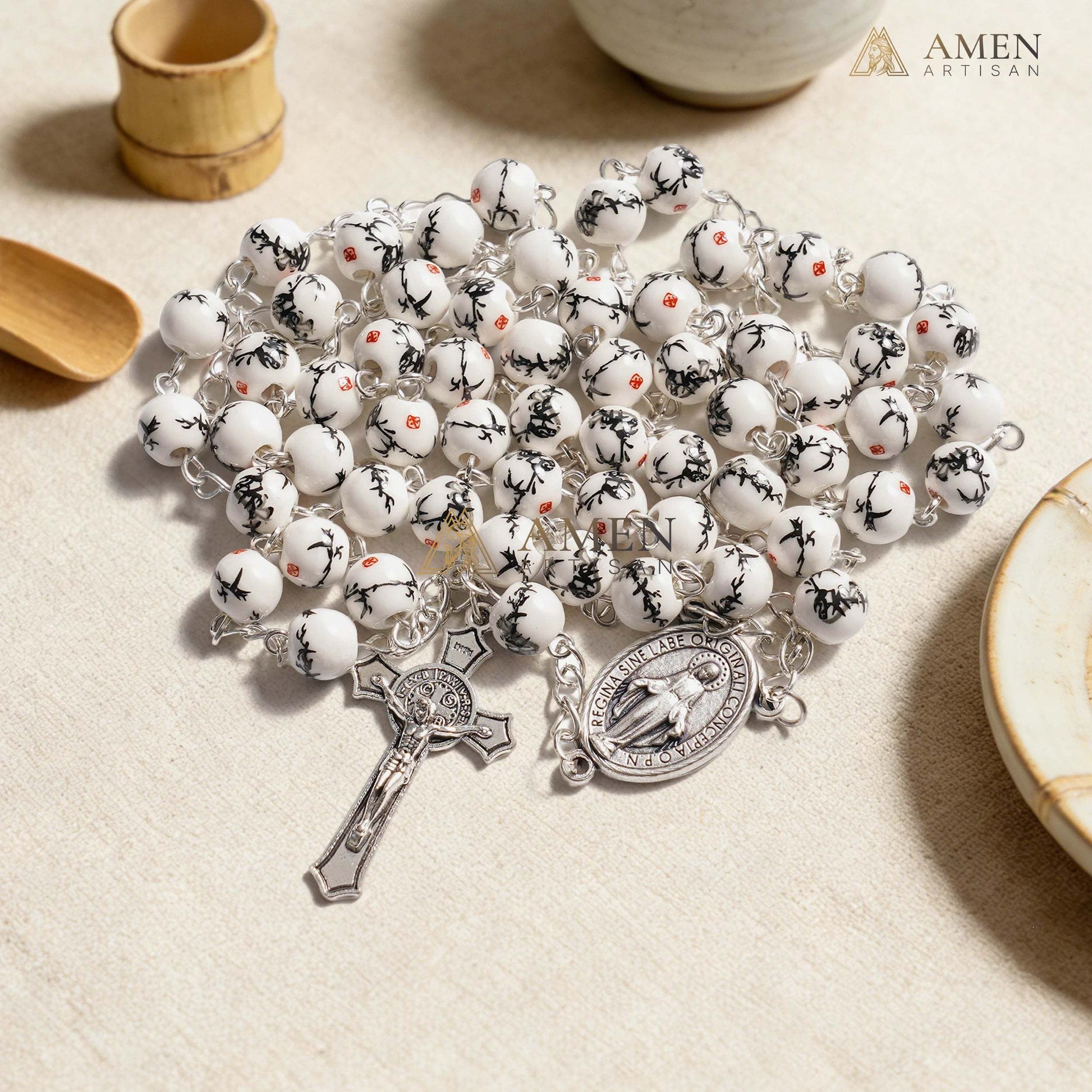 This ink bamboo ceramic rosary blends Eastern zen with Western faith: white ceramic beads with black bamboo texture paired with a metal chain, featuring a Miraculous Medal and crucifix — merging "prayer focus" with "artisanal texture" into a wearable faith accessory.