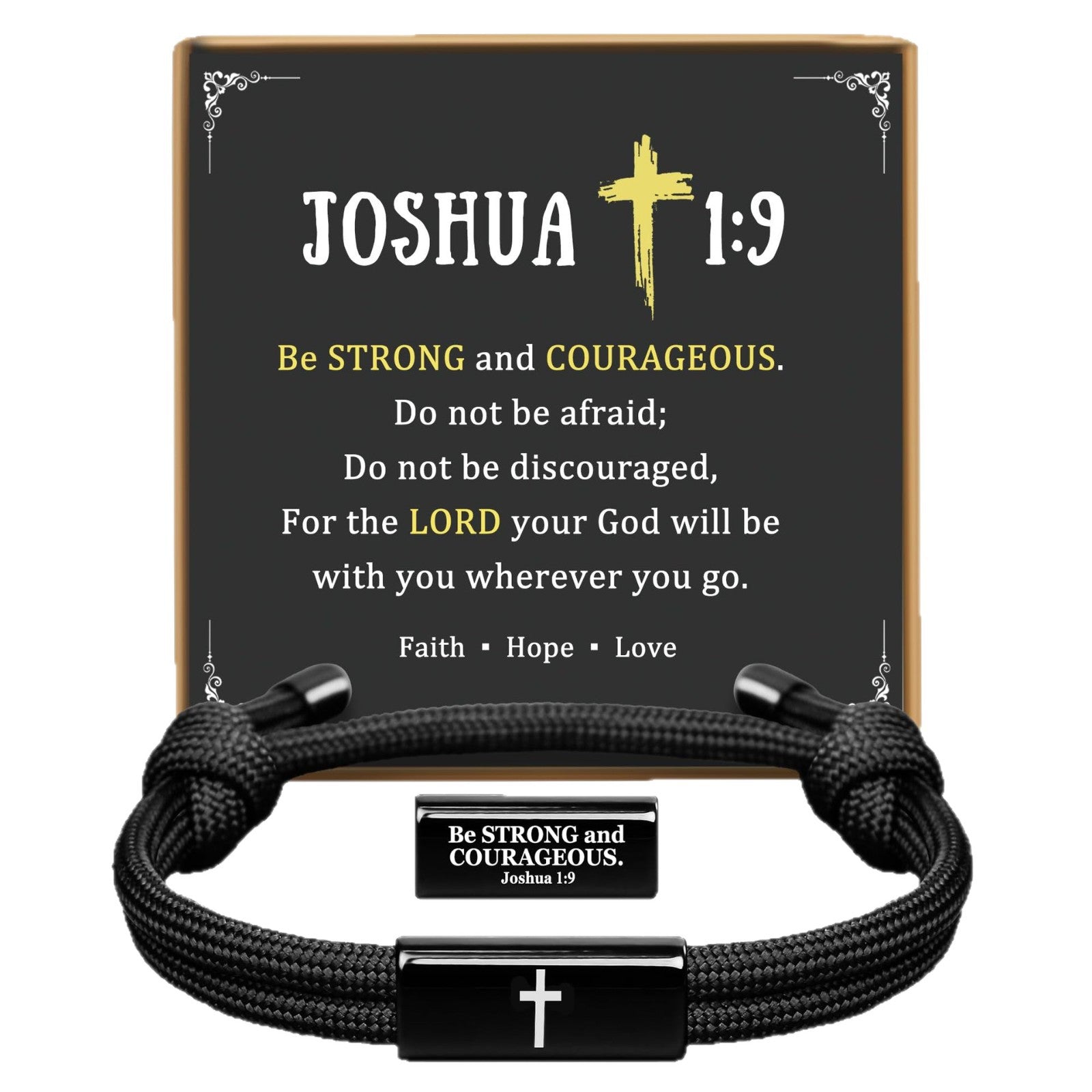 Crafted with durable paracord and a cross centerpiece engraved with Joshua 1:9, this bracelet symbolizes strength, courage, and God’s constant presence in every step of life.