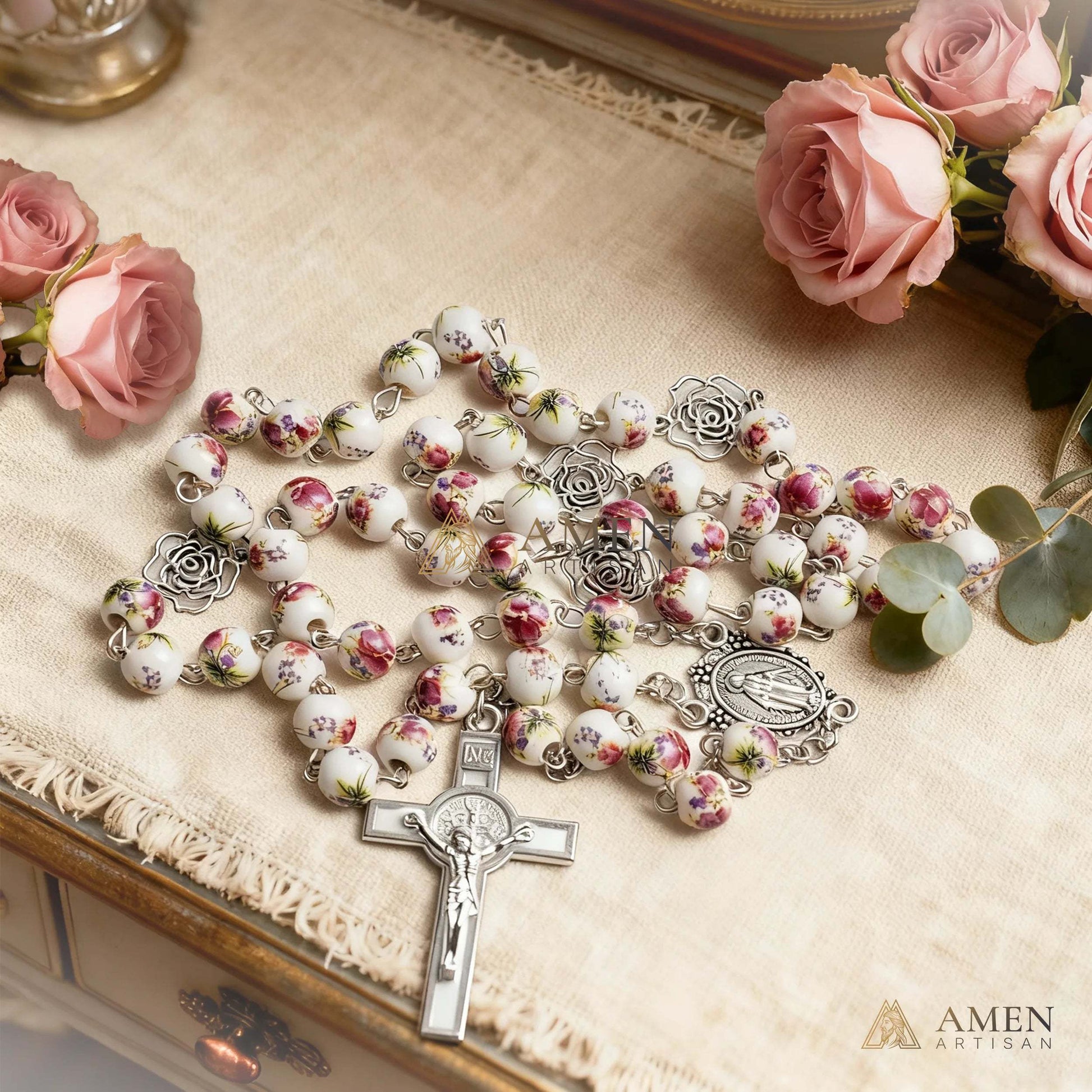 This rose ceramic rosary blends romantic poetry with devout faith: white ceramic beads with pink rose patterns paired with a vintage metal chain, featuring a Miraculous Medal and crucifix — merging "prayer focus" with "rose tenderness" into a wearable faith accessory.