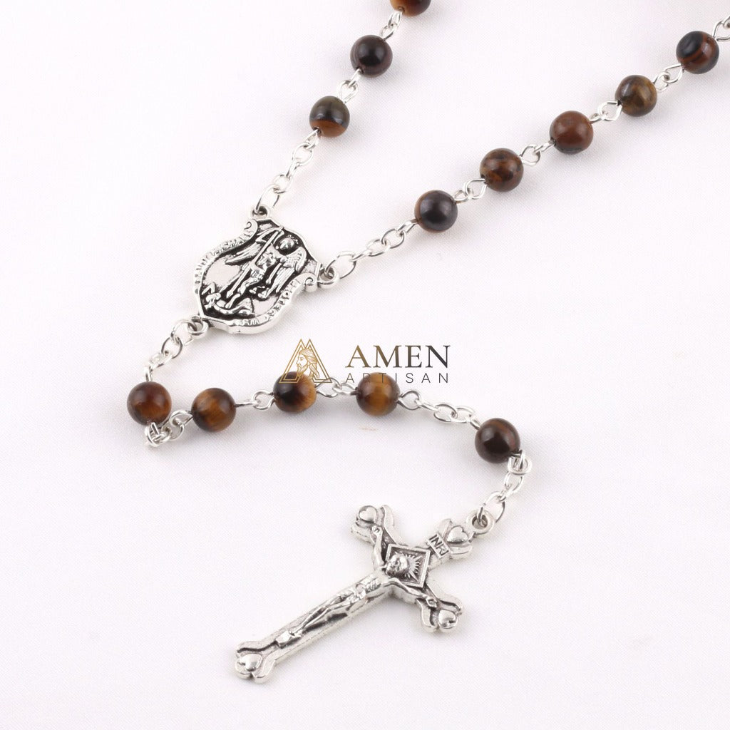 Crafting: Hand-strung tiger's eye beads; metal charms with embossed Saint Michael/crucifix details — aligned with traditional rosary rules