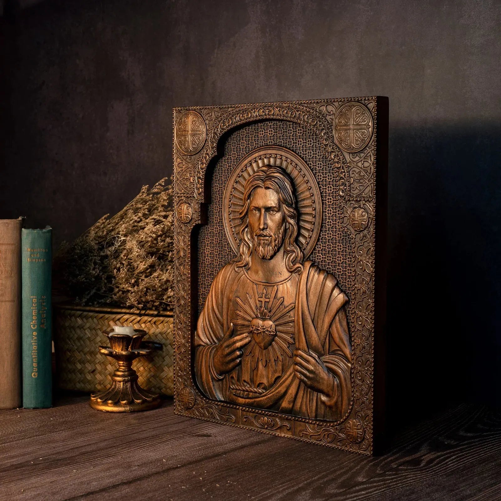 Sacred Heart of Jesus Wood Carved Relief Decor Amen Artisan